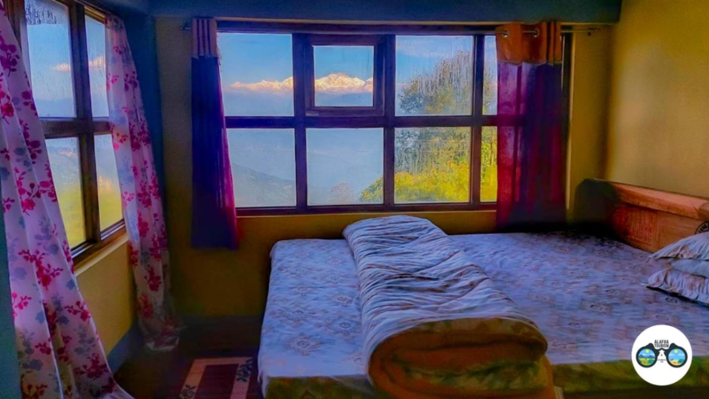 The homestay features 4 well-furnished rooms — 2 rooms on the top floor with panoramic Kanchenjunga views and 2 rooms on the ground floor perfect for families or elderly guests. Each room is equipped with cozy bedding, wooden interiors, attached bathrooms with hot water, and large windows that fill the space with mountain light and fresh air.